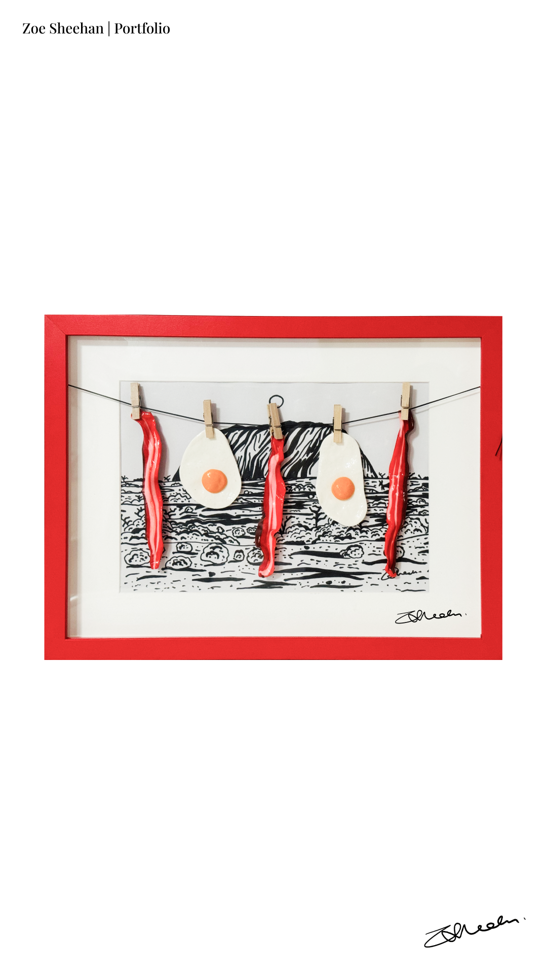 Featuring glossy bacon strips and perfectly cooked eggs hanging on a rope with miniature pegs, this playful yet striking piece is set against a textured illustration of Uluṟu, blending contemporary design with unmistakable Aussie culture.